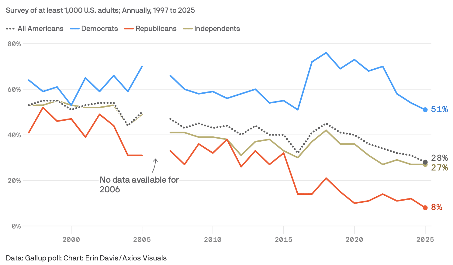 For the third year in a row, trust in the news media has fallen to a record low. According to Gallup, only 28% of Americans say they trust what they read or see. Among Democrats, that number is 51%. Independents: 27%. Republicans: just 8%.